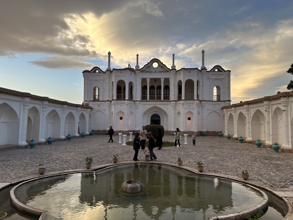 عمارت اصلی باغ فتح‌آباد کرمان با انعکاس در حوض مقابل